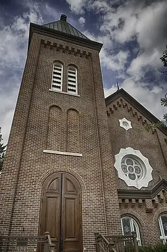 The congregation was officially formed in 1820 as the First Methodist Society, with 7 congregants. Its first church building was a frame church on South Main Street, completed in the fall of 1821 under the supervision of church member Nathan Vaught, who was a master builder. Vaught also supervised the construction of the congregation's next building, built in 1836 at the site of the present church. That church building burned in 1874 and was replaced by the present building, which was started in 1875 and completed in 1876.[2]