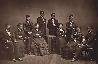 The singers were organized as a fundraising effort for Fisk University. The historically black college in Nashville, Tennessee, was founded by the American Missionary Association and local supporters after the end of the American Civil War to educate freedmen and other young African Americans. In 1871, the five-year-old university was facing serious financial difficulty. To avert bankruptcy and closure, Fisk's treasurer and music director, George Leonard White, a white Northern missionary dedicated to music and proving African Americans were the intellectual equals of whites,[2] gathered a nine-member student chorus, consisting of four black men (Isaac Dickerson, Ben Holmes, Greene Evans, Thomas Rutling) and five black women (Ella Sheppard, Maggie Porter, Minnie Tate, Jennie Jackson, Eliza Walker) to go on tour to earn money for the university. On October 6, 1871, the group of students, consisting of two quartets and a pianist, started their U.S. tour under White's direction.[3] They first performed in Cincinnati, Ohio. Over the next 18 months, the group toured through Ohio, Pennsylvania, New York, Connecticut, Rhode Island, New Jersey, Massachusetts, Maryland, and Washington, D.C.[4]
