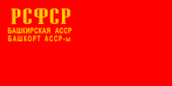 After the formation of the Bashkir ASSR, the first flag of the Bashkir ASSR was adopted in 1922. The flag was a red flag, with the abbreviation of the name of the republic inscribed in the flag.[5] The flag was used until 11 October 1924, when the decree "On the change of the State flag of the Bashkir ASSR", changed the design of the flag of the Bashkir ASSR. The inscription in the flag was replaced with the hammer and sickle.[6]