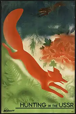 The red fox (Vulpes vulpes) is the normal prey animal of a fox hunt in the US and Europe. A small omnivorous predator,[47] the fox lives in burrows called earths,[48] and is predominantly active around twilight (making it a crepuscular animal).[49] Adult foxes tend to range around an area of between 5 and 15 square kilometres (2–6 square miles) in good terrain, although in poor terrain, their range can be as much as 20 square kilometres (7.7 sq mi).[49] The red fox can run at up to 48 km/h (30 mph).[49] The fox is also variously known as a Tod (old English word for fox),[50] Reynard (the name of an anthropomorphic character in European literature from the twelfth century),[51] or Charlie (named for the Whig politician Charles James Fox).[52] American red foxes tend to be larger than European forms, but according to foxhunters' accounts, they have less cunning, vigour and endurance in the chase than European foxes.[53]
