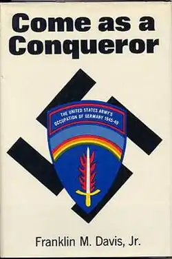 Front cover of the 1967 Macmillan Company hardcover version of Come As A Conqueror by Franklin M. Davis Jr. The book was advertised the "first comprehensive history of the most difficult political-military operation in America's history: the U.S. Army's occupation of Germany 1945–1949."[1]