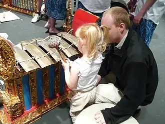 Kettle gongs are round, bronze, and pitched. They are often mounted horizontally on suspended chords as part of a frame. Positioned this way, there is an opening on the bottom, slightly beveled bow on top, and a protruding center called the boss. The kettles are arranged from low to high, left to right. They are generally played with a wooden mallet wrapped in string on one end (to soften the attack) or the end of the mallet, which is bare, finished wood. Mallets are held one in each hand as extensions of pointed index fingers. There are four conventional strikes: