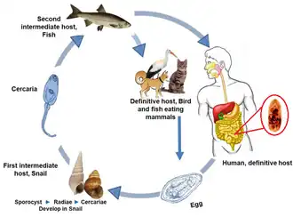 - ^ a b Tang, Ze-Li; Huang, Yan; Yu, Xin-Bing (2016-07-06). "Current status and perspectives of Clonorchis sinensis and clonorchiasis: epidemiology, pathogenesis, omics, prevention and control". Infectious Diseases of Poverty. 5 (1): 71. doi:10.1186/s40249-016-0166-1. ISSN 2049-9957. PMC 4933995. PMID 27384714.