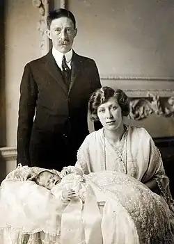 George Lascelles was born at his parents' London home of Chesterfield House on 7 February 1923, the first child of Henry, Viscount Lascelles, and Princess Mary, Viscountess Lascelles, and first grandchild of King George V and Queen Mary, who stood as sponsors at his christening. The christening took place on 25 March 1923 at St Mary's Church in the village of Goldsborough, near Knaresborough adjoining the family home Goldsborough Hall.[2] After his paternal grandfather's death in 1929, he was styled as Viscount Lascelles as his father succeeded to the earldom. He served as a Page of Honour at the coronation of his uncle King George VI in May 1937.