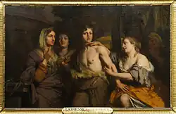At first, De Lairesse was highly influenced by Rembrandt, but later he focused on a more French-oriented style similar to Nicolas Poussin.[16] The French even nicknamed him the "Dutch Poussin", although he was also influenced by Pierre Mignard and Charles Alphonse du Fresnoy.
