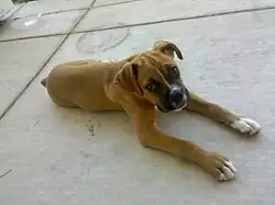 Boxers with white markings covering more than one-third of their coat – conventionally called "white" Boxers – are neither albino nor rare; about 20–25% of all Boxers born are white.[14] Genetically, these dogs are either fawn or brindle, with excessive white markings overlying the base coat color. Like fair-skinned humans, white Boxers have a higher risk of sunburn and associated skin cancers than darker Boxers. The extreme piebald gene, which is responsible for white markings in Boxers, is linked to congenital sensorineural deafness in dogs. An estimated 18% of white Boxers are deaf in one or both ears,[15] though Boxer rescue organizations see about double that number.[16][17]