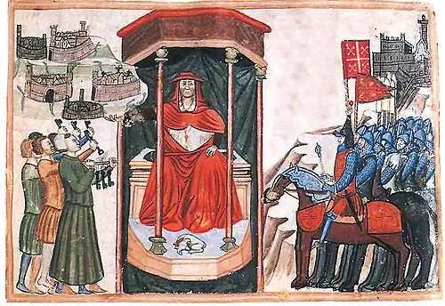 At the battle of Río Salado he successfully fought against a Marinid invasion from Morocco in 1340, and at the taking of Algeciras in 1344 he led the armed levy of his archbishopric.[3] As Archbishop of Toledo he held two reform synods; one at Toledo in May 1339, the other at Alcalá in April 1347. In 1343 he had been sent to Pope Clement VI at Avignon to negotiate a grant of a tax on the revenues of the Church for the Crusade. Albornoz left Spain on the death of the king Alfonso XI in March 1350, and never returned. It has been said, but not on contemporary evidence, that he fled from fear of Pedro of Castile. His military and diplomatic ability became known to the pope, who made him a cardinal-priest of S. Clemente in December of that year, at which point he resigned the archbishopric of Toledo.[5][6]