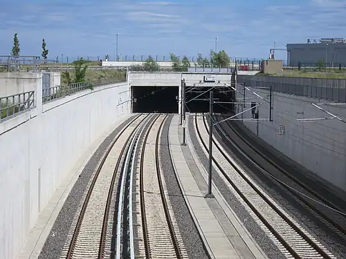 ![]() Entrance to the tunnel under the runway of the airport. On the left is the S-Bahn from Schönefeld and on the right the long-distance line from Glasower Damm. | |||||||||||||||||||||||||||||||||||||||||||||||||||||||||||||||||||||||||||||||||||||||||||||||||||||||||||||||||||||||||||||||||||||||||||||||||||||||||