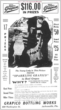 In June 1922, Grapico Bottling Works furthered the connection between the artificially flavored beverage and real grape juice through an advertisement campaign.[22] On June 1, 1922, The Jacksonville Metropolis published a Grapico Bottling Works advertisement announcing a ten-day writing contest that offered US$116 in prize money for essays on why a consumer would prefer "Sparkling Grapico" over real, fresh grapes.[22] The advertisement indicated that Grapico was made from Pure Grape Juice with pure sugar and carbonated water and had no coloring or preservatives.[22] Although not true, this information was consistent with the Grapico product labels used by J. Grossman's Sons on the barrels that were shipped to and received by R. R. Rochell.[23]