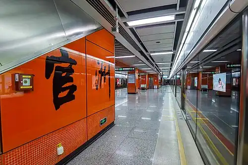 Guanzhou Station (Chinese: 官洲站; pinyin: Guānzhōu Zhàn; Cantonese Yale: Gūnjāu Jaahm) is an interchange station between Line 4 and Line 12 of the Guangzhou Metro. The Line 4 station started operations on 26 December 2005. It is located at the underground of the central part of Guanzhou Island in Haizhu District.[1] It was constructed to cope with the Guangzhou International Biological Island,[2] a science and technology development zone led by biological industry that opened in 2011.[3][4]
