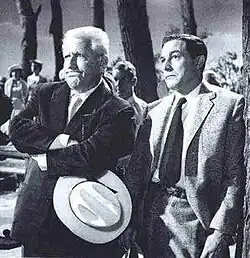 Mencken is fictionalized in the play Inherit the Wind (a fictionalized version of the Scopes Monkey Trial of 1925) as the cynical sarcastic atheist E. K. Hornbeck (right), seen here as played by Gene Kelly in the Hollywood film version. On the left is Henry Drummond, based on Clarence Darrow and portrayed by Spencer Tracy.