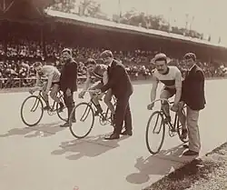 The final of the Grand Prix de Paris on 29 June 1902; from left to right: Alphonse Didier-Nauts, Willy Arend, and Harrie Meyers