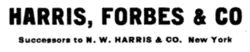 Harris, Forbes & Co. began in 1882 as N. W. Harris & Co. At that time Founder Norman Wait Harris had an office on Chicago's Clark Street, three employees and $30,000. But he also had two ideas. First idea was to send salesmen out to sell bonds. In 1882 such procedure was regarded as undignified; Mr. Harris and his men were termed doorbell ringers. But Mr. Harris knew that he, small, new, obscure, would never prosper by waiting for investors to call upon him, so he rang the doorbells, sold the bonds, became ancestor of all bond salesmen since.