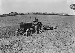 In modern mechanized farming, generally a farmer will use two harrows, one after the other. The disk harrow is used first to slice up the large clods left by the mould-board plough, followed by the spring-tooth harrow. To save time and fuel they may be pulled by one tractor; the disk hitched to the tractor, and the spring-tooth hitched to, and directly behind, the disk. The result is a smooth field with powdery dirt at the surface.
