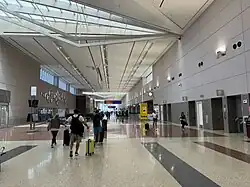 The airport has a total of 110 gates across two passenger terminals, which are numbered 1 and 3, and a satellite concourse called Concourse D. Terminal 1 contains three concourses labeled A, B, and C. Terminal 3 houses the E gates and handles international arrivals.[79] Terminal 3 and Concourse D are able to receive international flights, and a tunnel links the international gates in Concourse D to the customs checkpoint.[66] Of these international gates, Concourse D has a 3-jetway stand (D21/22) that can accommodate an Airbus A380, the largest commercial airplane in the world.[80] There is an airside tram system with three lines. The green and blue lines connect the central part of Terminal 1 with Concourses C and D, respectively. The red line runs between Terminal 3 and Concourse D.[81]
