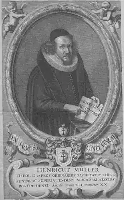 Heinrich Müller (18 October 1631 – 13/23 September 1675) was a German devotional author, Protestant writer of hymns, a Lutheran minister and theologian and a professor at the University of Rostock from 1647 to 1650.[1][2] He famously denounced the font, the pulpit, the confessional, and the altar as "the four dumb idols of the Lutheran Church". He died in Rostock, aged 43.