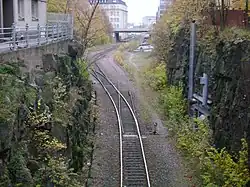 The Helsinki harbour rail line (Finnish: Helsingin satamarata) was a side rail track in Helsinki, Finland, built in the 1890s, and dismantled in 2009. Originally it led from the Helsinki Central railway station, via the city's coastline, to Katajanokka. Its original length was 7 kilometres (4.3 mi), but in its final stage, its length was only about 3 kilometres (1.9 mi). In the final phase the track had two level crossings and a rail yard in the Länsisatama (West Harbour). Near the start of the track were the former VR warehouses. It was used only by trains going to the harbour and Hietalahti shipyard, but special request trains have also travelled the track.