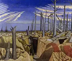 After resting and refitting, at Eringhem and Houtkerque, the 4th Bedfords moved south with 63rd (RN) Division to join Third Army and by 21 December was holding the support trenches on Highland Ridge where the German counter-attack after the Battle of Cambrai had been halted. The battalion was in camp at Havrincourt Wood when Germans attacked again on 30 December and was moved up to the line at one hour's notice, moving into the front line next day, where it suffered a few casualties while 1st Artists Rifles and 7th RF made a bloody counter-attack towards Marcoing.[107][108][109][132][133][134][135] The battalion spent January 1918 taking turns in the front line and suffering casualties, many from Mustard gas. On 9 February the 4th Bedfords were reinforced by a draft of 11 officers and 299 ORs from the 8th (Service) Bn of the Bedfords, a Kitchener battalion that was being disbanded. However, on 13 March the battalion was heavily shelled with mustard gas and five officers and 264 ORs had to be evacuated suffering from the effects.[104][107]