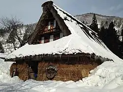 The Gasshō-style house ("prayer-hands construction" style) is characterized by a steeply slanting thatched roof, resembling two hands joined in prayer.[2] The design is exceptionally strong and, in combination with the unique properties of the thatching, allows the houses to withstand and shed the weight of the region's heavy snowfalls in winter.[1]: 70