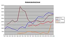 The game continued to struggle during this decade, with only five senior clubs affiliated in 1909, increasing to seven senior and nine junior clubs in 1910. At the annual meeting of the QBFA in September 1910, the secretary reported that the association was "without doubt, the strongest association that had existed for some considerable time."[61] Australian Rules football appeared to be faring little better in Brisbane around this time, as the Ipswich A Grade side beat Brisbane 102 points to 1.[62] It was also 1909 that saw the inaugural Brisbane Rugby League competition, with that game ultimately becoming the dominant code in Brisbane (see below).