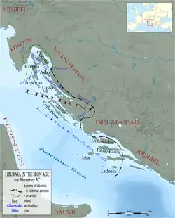 5. ^ Wilkes 1992, p. 183: "... We may begin with the Venetic peoples, Veneti, Carni, Histri and Liburni, whose language set them apart from the rest of the Illyrians...."
