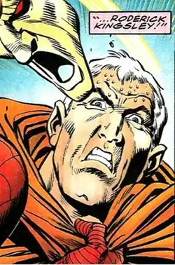 Roderick Kingsley became a socialite, fashion designer and billionaire with criminal underworld connections by using unethical business practices and corporate raiding. Kingsley was an employer of Mary Jane Watson for a time.[13] As a means of avoiding the drill of day-to-day appearances, he has his timid identical twin brother Daniel Kingsley pose as him to run his corporation.[14] Kingsley's activities give him many enemies, one of which is Bella Donna (Narda Ravanna), a rival fashion designer whose business he ruined. She attempts revenge on Kingsley but is twice thwarted by Spider-Man.[15][16][17]