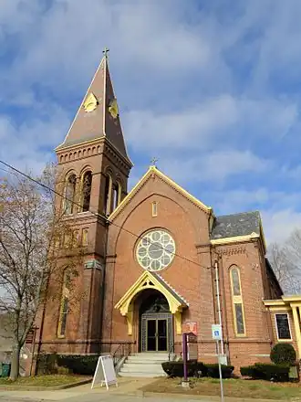 The Holy Trinity Episcopal Church, formerly the Evangelical Free Church, is a historic church building at 446 Hamilton Street in Southbridge, Massachusetts. Built in 1869 for a nominally non-denominational congregation of senior Hamilton Woolen Company employees, it has house an Episcopal congregation since 1921. The building is architecturally noted for its Romanesque and Gothic Revival features, and was listed on the National Register of Historic Places in 1989.[1]