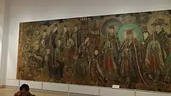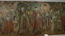 The procession is led by a fierce warrior, the Lord of the Southern Dipper (Sagittarius). He leads nine star spirits, female attendants with plant offerings, three important deities, and personifications of the twelve Earthly Branches. The three deities have been identified as Laozi (founder of Daoism) with the Jade Emperor and the Empress of Heaven, or Laozi with the Holy Ancestor and Ancestress of the Song Dynasty (960–1279).[1] [2] [3] [4]