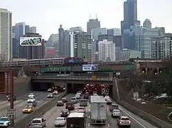 Where Hubbard Street crosses over the Kennedy Expressway, there is a long underpass popularly known as Hubbard's Cave. The underpass is about a quarter of a mile in length, and actually extends from Hubbard Street to Wayman Street. This tunnel-like section of the expressway was very dark to drive through until lights were added in 1962.[1][2]