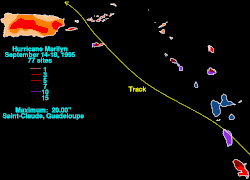 Hurricane Marilyn was the most powerful hurricane to strike the Virgin Islands since Hurricane Hugo of 1989, and the third such tropical cyclone in roughly a two-week time span to strike or impact the Leeward Islands, the others being Hurricane Iris and the much more powerful and destructive Hurricane Luis. The thirteenth named storm, seventh hurricane and third major hurricane of the extremely active 1995 Atlantic hurricane season, Marilyn formed on September 12 as a tropical depression from a tropical wave that moved off the coast of Africa on September 7. After formation, the storm quickly became a tropical storm, and steadily intensified into a hurricane by the time it struck the Lesser Antilles on September 14 at Category 1 strength. Entering the northeastern Caribbean Sea, rapid intensification ensued and it peaked on September 16 north of Puerto Rico as a Category 3 hurricane shortly after it had impacted the U.S. Virgin Islands. A Hurricane Hunter reconnaissance flight reported hail, which is unusual for tropical cyclones. After heading north past Bermuda, Marilyn weakened and became extratropical on September 22. The remnant circulation wandered the Atlantic Ocean from September 23 – October 1, just south of Nova Scotia.
