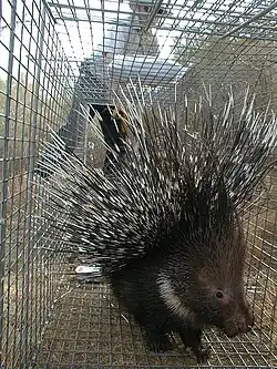 It is covered in multiple layers of modified hair called quills, with longer, thinner quills covering a layer of shorter, thicker ones.[2] The quills are brown or black with alternating white and black bands.[4] They are made of keratin and are relatively flexible.[4] Each quill is connected to a muscle at its base, allowing the porcupine to raise its quills when it feels threatened.[4] The longest quills are located on the neck and shoulder, where the quills form a "skirt" around the animal.[4] These quills can grow up to 51 cm (20 in) long,[4] with most measuring between 15 and 30 cm (5.9 and 11.8 in).[5] Smaller (20 cm) and more rigid quills are packed densely on the back and rump.[4] These smaller quills are used to stab at potential threats.[4] The base of the tail contains shorter quills that appear white in color, with longer, hollow quills that the porcupine can rattle to produce a warning sound when threatened.[6] Contrary to popular belief, Indian crested porcupines (like all porcupines) cannot shoot their quills.[4]