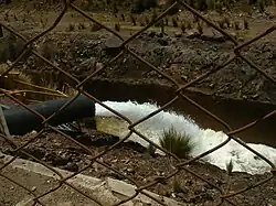 Additionally, the geologic formations that harbour economically valuable metals such as copper and gold very often consist of sulphide-type ores. The processing entails grinding the rock into fine particles and then extracting the desired metal(s), with the leftover rock being known as tailings. These tailings contain a combination of not only undesirable leftover metals, but also sulphide components which eventually form sulphuric acid upon the exposure to air and water that inevitably occurs when the tailings are disposed of in large impoundments. The resulting acid mine drainage, which is often rich in heavy metals (because acids dissolve metals), is one of the many environmental impacts of mining.[31]