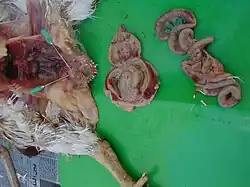Infectious bursal disease (IBD), also known as Gumboro disease, infectious bursitis, and infectious avian nephrosis, is a highly contagious disease of young chickens and turkeys caused by infectious bursal disease virus (IBDV),[1] characterized by immunosuppression and mortality generally at 3 to 6 weeks of age. The disease was first discovered in Gumboro, Delaware in 1962. It is economically important to the poultry industry worldwide due to increased susceptibility to other diseases and negative interference with effective vaccination. In recent years, very virulent strains of IBDV (vvIBDV), causing severe mortality in chicken, have emerged in Europe, Latin America, South-East Asia, Africa, and the Middle East. Infection is via the oro-fecal route, with affected birds excreting high levels of the virus for approximately 2 weeks after infection. The disease is easily spread from infected chickens to healthy chickens through food, water, and physical contact.[2]