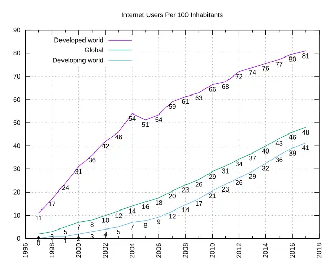 108. ^ "Individuals using the Internet 2005 to 2014" Archived 28 May 2015 at the Wayback Machine, Key ICT indicators for developed and developing countries and the world (totals and penetration rates), International Telecommunication Union (ITU). Retrieved 25 May 2015.