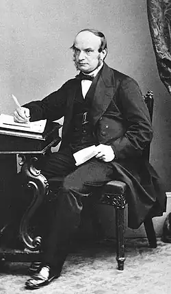 The great meteor shower of November 1866 turned his attention to the Leonids, whose probable path and period had already been discussed and predicted by Hubert Anson Newton in 1864.[1] Newton had asserted that the longitude of the ascending node, that marked where the shower would occur, was increasing and the problem of explaining this variation attracted some of Europe's leading astronomers.[3]