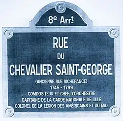 After defeating Picard in 1761 or on graduation from the academy in 1766, Bologne was made a Gendarme du roi (officer of the king's bodyguard) in Versailles and a chevalier.[29][30] He then adopted the suffix of his father's plantation and was known as the "Chevalier de Saint-Georges".