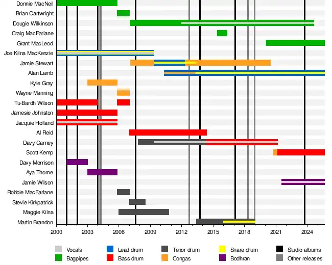 | Past members | Joe Kilna MacKenzie Tu-Bardh Wilson Jamesie Johnston Jaquie Holland Donnie MacNeil Davy Morrison Aya Thorne Kyle Gray Brian Cartwright Wayne Manning Robbie MacFarlane Stevie Kirkpatrick Maggie Kilna Al Reid Craig MacFarlane Martin Brandon Jamie Stewart Davy Carney Dougie Wilkinson |