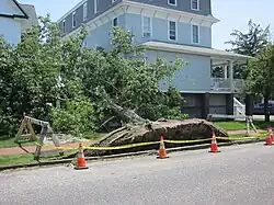 Damage was widespread and extensive along the entire path of the derecho, especially in northern Indiana and the Fort Wayne metro area, central and western Ohio, northeastern Kentucky, southwestern Pennsylvania, West Virginia, northern, central, and southwestern Virginia,[15] Maryland, Washington, D.C., Delaware and southern New Jersey. In all the mentioned areas, many trees uprooted or snapped, roofs became damaged, tents deployed to sell fireworks leading up to the 4th of July Holiday collapsed, and power outages were extensive, with over 4.2 million customers losing power as a result.[16] [17] An Appalachian Power representative described the power outage as the worst the company had ever seen.[15] In total, 22 people were killed across seven states and the District of Columbia.[18] At least ten of those deaths were in Virginia, all of them due to fallen trees.[15] Two of the deaths were in New Jersey, after two children were killed by falling trees at a campground at Parvin State Park, three deaths were reported in Maryland and one death was reported in Ohio after the storm.[19] As it occurred in the midst of the record Summer 2012 North American heat wave, conditions on following days were problematic, particularly for seniors and vulnerable people. Scattered structural damage also occurred along the path of the derecho, from both falling trees and the winds themselves. Some of the damage included siding was torn off houses, roofs removed from houses, businesses and apartment buildings, mobile homes heavily damaged, barns and garages destroyed and airplanes flipped.[7]