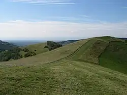 ![]() The Kaiserstuhl hills including the Totenkopf with its transmission tower, the village of Oberbergen beyond it and the Rhine River in the background (aerial view looking north-northwest) | |