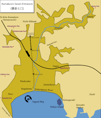 The city of Kamakura, Kanagawa in Japan, is closed off on three sides by very steep hills and on the fourth by the sea: before the construction of several modern tunnels and roads, the so-called Seven Entrances (Nana-guchi), or Seven Passes (七切り通し, Nana-kiridoshi) (all artificial) were its main links to the rest of the world.[1] The city was therefore a natural fortress and, according to the Azuma Kagami, it was chosen by Minamoto no Yoritomo as his base specifically for this reason.[2] The name itself seems to have been modeled on that of Kyoto's Seven Entrances (京都七口)—sometimes translated as the seven "mouths"—which first appears in the literature of the intermediate Muromachi period (around the year 1450).[1] Together with the other "numbered" names like "Kamakura's Ten Wells" and "Kamakura's Ten Bridges", the modern "Seven Entrances" is an Edo period invention probably concocted to stimulate tourism.[3] The Azuma Kagami calls them simply -zaka: Kobukurozaka, Daibutsuzaka, Gokurakuzaka, etc.[3] Besides these seven, there were always other mountain roads that connected Kamakura with, for example, Kotsubo and Shichirigahama.[3] There is one, for example, that connects Kaizō-ji in Ōgigayatsu with Kita-Kamakura Station.[4] The Seven Entrances were simply the most convenient and important.[3]