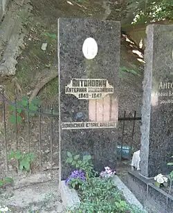 From 1919 she worked for the All-Ukrainian Academy of Sciences, where she headed the library department in the 1920s, but she was removed from her position in 1930 because of her politics.[3] Antonovych-Melnyk was a member of the Shevchenko Scientific Society in Lviv and the Ukrainian Scientific Society in Kyev, founded in 1907. She was involved in the creation of the museums at the University of Kiev and in Dnipro.[3] From 1929 she prepared the printing of the first two volumes of the complete works of her husband. Kateryna Antonovych-Melnyk died in Kiev in 1942 and was buried at the Baikove Cemetery.