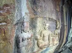 Mo Ee Daeng Cliff rears over 500 metres above the Cambodian plain. In 1987, a Border Protection Ranger Unit discovered two groups of bas-relief images and engravings. The Management Plan says on p. 14, "Based on iconography, the figures are dated circa 10th century, or older than Preah Vihear Temple." The figures are now a highlight of the park. Some parts have flaked off, so the area is barred behind a gate. A staircase leads down to the gate, where the images are clearly visible.