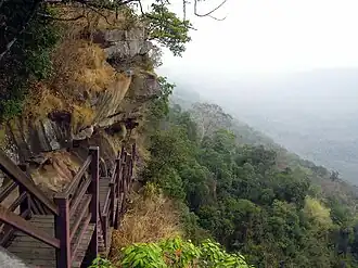 Khao Phra Wihan National Park (Thai: อุทยานแห่งชาติเขาพระวิหาร) is a protected natural area in Sisaket Province, Thailand, that contains numerous ruins of the 11th century Khmer Empire. The park lies 98 km (61 mi) south of the town of Sisaket, at the end of Thai highway 221. Sited on a red stone cliff that is part of the Dangrek mountain range on the southern edge of the Khorat Plateau, it abuts the international border between Thailand's Sisaket Province and Cambodia's Preah Vihear Province. The name of the cliff in the Royal Thai General System of Transcription is Pha Mo I Daeng (ผามออีแดง). The park was established on 20 March 1998,[1] with an area of 81,250 rai ~ 130 square kilometres (50 sq mi).[2]