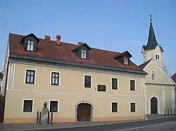 The town's parish church is dedicated to Saint James and belongs to the Roman Catholic Diocese of Novo Mesto. It is an originally 13th century Romanesque building that was largely rebuilt in the Baroque style in the 17th century.[13] Kostanjevica Cave (Slovene: Kostanjeviška jama), a popular tourist destination, is nearby.