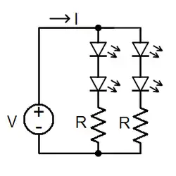 Strings of multiple LEDs are normally connected in series. In one configuration, the source voltage must be greater than or equal to the sum of the individual LED voltages; typically the LED voltages add up to around two-thirds of the supply voltage. A single current-limiting resistor may be used for each string.