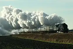 On 9 September 2015, 60009 hauled a train carrying Queen Elizabeth II along with Prince Philip, Duke of Edinburgh and Scottish First Minister Nicola Sturgeon to officially re-open the Borders Railway between Edinburgh Waverley and Tweedbank. The locomotive subsequently operated railtours on the line throughout September. In 2017 John Cameron announced that 60009 would be withdrawn when its boiler ticket expires and placed in the Farming and Railway Visitor Centre in Fife.[7][8] In March 2019 a 12-month extension to the boiler certificate was granted.[9] On 7 March 2020 it hauled its last main line charter – from Ealing Broadway to York via the Midland Main Line – and was then stored at the National Railway Museum.[10][11] In October 2020 it was hauled from York to the East Lancashire Railway (ELR), where it entered service in April 2021.[12] It was due to remain operational on the ELR until its boiler certificate expire in April 2022. However, a cracked boiler tube was discovered in early October 2021 and it was retired with immediate effect. Its last public trains were on 3 September 2021, when the second loco in steam was fellow Gresley Pacific, A3 class No 60103 'Flying Scotsman'. In May 2022, Union of South Africa was placed on static display at the Bury Transport Museum in Bury, Greater Manchester.[13][14][15] As of April 2023, the locomotive has returned to Fife for static display at John Cameron's Farming and Railway Visitor Centre to be opened at his Balbuthie Farm. It will be displayed with his other locomotive, former LNER K4 class 61994 "The Great Marquess".