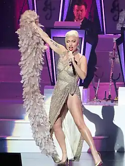 Designers who outfitted the Jazz & Piano shows include Ralph Lauren, Schiaparelli, Adrian Manceras, Armani Privé, and Gaga's sister, Natali Germanotta.[26][27] According to Germanotta, during their creative process they used "elements from the Jazz Age, mixed with cabaret and vintage Vegas."[27] Gaga's first ensemble for the show was a black sequin dress with a deep V neck, slit, crystal appliqués and crystal fringes.[28] The look was completed with a Rinaldy Yunardi headpiece featuring jet-black spikes sprouting from it. For Vogue's Alice Newbold, the headdress resembled the one worn by Cher for the 58th Academy Awards.[29] Gaga changed into a champagne-colored, long-sleeved gown with more than 53,000 Swarovski micro-crytals and 250 rock crystals, along with a white feather cape.[22][26][28] Later, a strapless black velvet gown was completed with a hot pink silk floor-length cape, which invoked the "Gentlemen Prefer Blondes-era" for Michael Love Michael of Paper Mag.[26][28] For the finale, Gaga put on a black lamé tuxedo jumpsuit, with a detachable tiered skirt, embellished with Swarovski crystals, along with white tuxedo shirt, bow, and a top hat.[26][28] Throughout the gig, Gaga was wearing various Jimmy Choo shoes.[28] Later shows were updated with various new outfits. This includes a dusty rose-hued, feathery dress with an allover ostrich-feather coat;[27] a black velvet bodice with a pink skirt, along with a cape coat with matching pink color;[27] a long shimmering rhinestone gown;[30] and a sparkling tassel dress reminiscent of a 1920s flapper, with matching head gear.[31] In the visuals during Gaga's costume-changes, she is seen in a velvet and lace corset and velvet skirt gown with silver crystal leafs by Turkish designer Nedret Taciroğlu.[26]