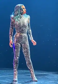 Gaga worked with Nicola Formichetti on selecting the various outfits for the residency.[20] For the Enigma show, the main inspiration was sci-fi,[21] and the list of designers included Tom Ford, Asher Levine, and Vex Latex.[22] Gaga's first look is a bejeweled, silver catsuit with built-in heeled boots, along with a black headpiece.[20][22][23] The outfit was covered in tiny mirrors, with Out magazine's Glenn Garner noting that "given her nightlife roots, it's fitting that she's channeling a disco ball at the beginning of her show".[20] Gaga then changed into a BDSM-inspired leather corset with neon green details. It was completed with a black PVC jacket with her initials written on the back side of it, featuring feathers in the same fluorescent green.[20][22][23] A later look was an armor-inspired suit with light-up panels,[20][22] which received comparison to a Patricia Field costume "for a movie about a late '80s heavy metal singer".[20] Gaga also appeared in a transparent purple dress, with a metallic purple cut-out bodysuit underneath.[20][22][23] For the finale, she was wearing a champagne-hued gold latex bodysuit with a collar which created the illusion of wings.[23][24] Out's Garner compared it to outfits from The Fifth Element and ones worn by David Bowie.[20] Removing the outfit revealed a second-skin like, nude-colored unitard.[20][25]