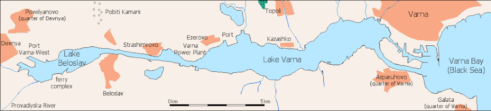 The Varna Necropolis, where the oldest gold treasure in the world was found, is located near the north shore, while the city of Varna is situated at the lake's eastern extremity. Also along the north shore are the villages of Kazashko and Ezerovo, and the villages of Zvezditsa and Konstantinovo overlook the lake from the southern heights.