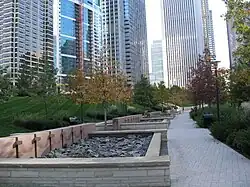 The park, named Lakeshore East Park, opened in 2005 and is supported by a mixture of public funds from the Chicago Park District and private funds from the neighboring Lakeshore East condominium buildings. It is the city's first and currently only free wireless park.[5] The park features several fountains.[18][19] The park is dog friendly and also home to a dog park where dogs can be let off leash.[20]